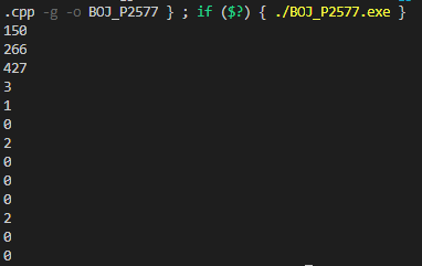 다음 과정을 진행하면 329에서 3까지 탐색했으니 2의 문자열을 처리할 것입니다. 위와 동일하게 '2'에서 '0'의 계산을 해주면, 아스키 값으로 봤을때, 50-48 = 2로 num[2]++의 과정을 거치게 될것입니다. 그럼 num에 저장된 값을 확인해보면 아래와 같을 것입니다.